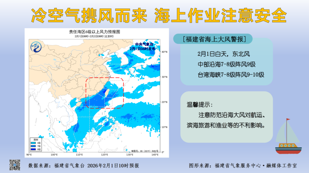 2月1日白天,东北风,中部沿海7~8级阵风9级,台湾海峡7~8级阵风9~10级,注意防范沿海大风对航运、滨海旅游和渔业等的不利影响。