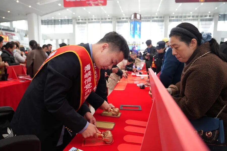 文化快闪,马年送福暖归途。春运首日,福州火车站结合闽文化与马年特色,开展“青春快闪”和马年送“姓”福活动。现场开展“我在福州”打卡,投壶、猜谜等文化活动;还邀请非遗剪纸传承人现场展示、书法家书写对联免费赠予旅客。