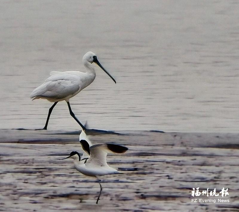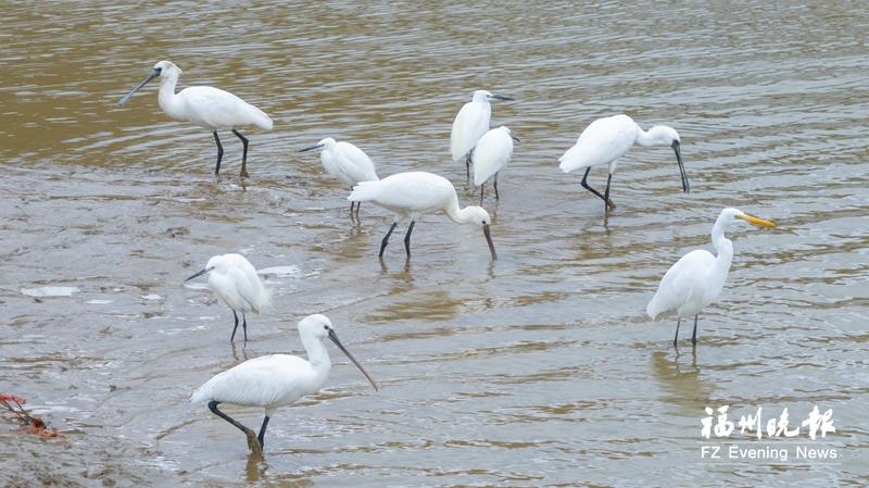 黑脸琵鹭现身福清龙江猪母湾湿地公园。