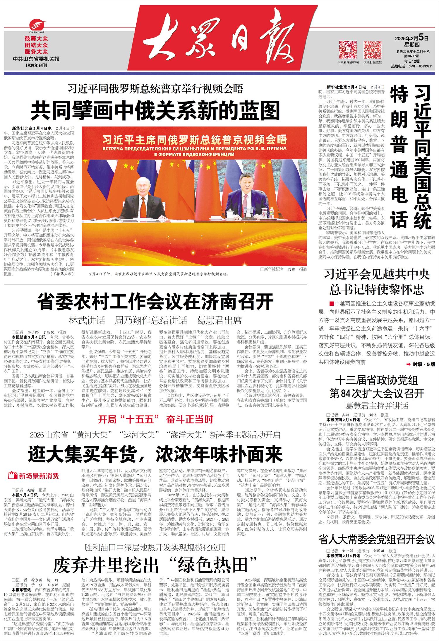 本报2月4日讯 今天上午,2026山东省“黄河大集”“运河大集”“海洋大集”新春季主题活动在菏泽东明县、德州天衢新区、烟台莱山区同步启动,活动将持续到3月20日(农历二月初二)。山东省“我们的中国梦——文化进万家”活动首场演出也在烟台莱山区同步开展。
