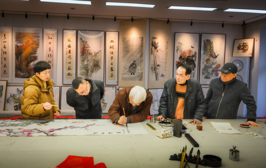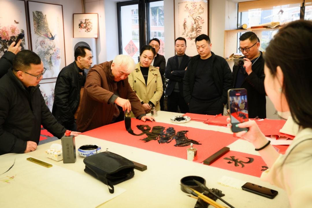活动现场墨香四溢、暖意融融,红色宣纸整齐铺展,笔墨纸砚摆放有序,浓浓的年味与清雅的墨香交织在一起,省市著名书画家陈元邦、李大林、刘闽东、陈超星、陈锐等挥毫泼墨,笔走龙蛇间,一幅幅兼具艺术美感与美好寓意的书画作品相继诞生。五位书画家还为本次联谊会合绘了一幅花鸟书画作品“君子同风”,饱含着对新春佳节的美好祈愿,也寄托着对辖区企业蓬勃发展、瀛洲片区繁荣进步的殷切期许。