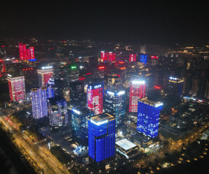 华灯初上,高新区化作璀璨星河。海西园沿江建筑群身披“中国红”与“科技蓝”交织的华服,流动呈现“新春大吉”“福暖四季”等祝福语,倒映乌龙江面,虚实相生如入画境。创新园三期楼体通过光影编程与激光特效,幻化出数据流瀑、智慧光轮等未来意象,彰显高新区在人工智能、数字经济赛道的蓬勃脉动。