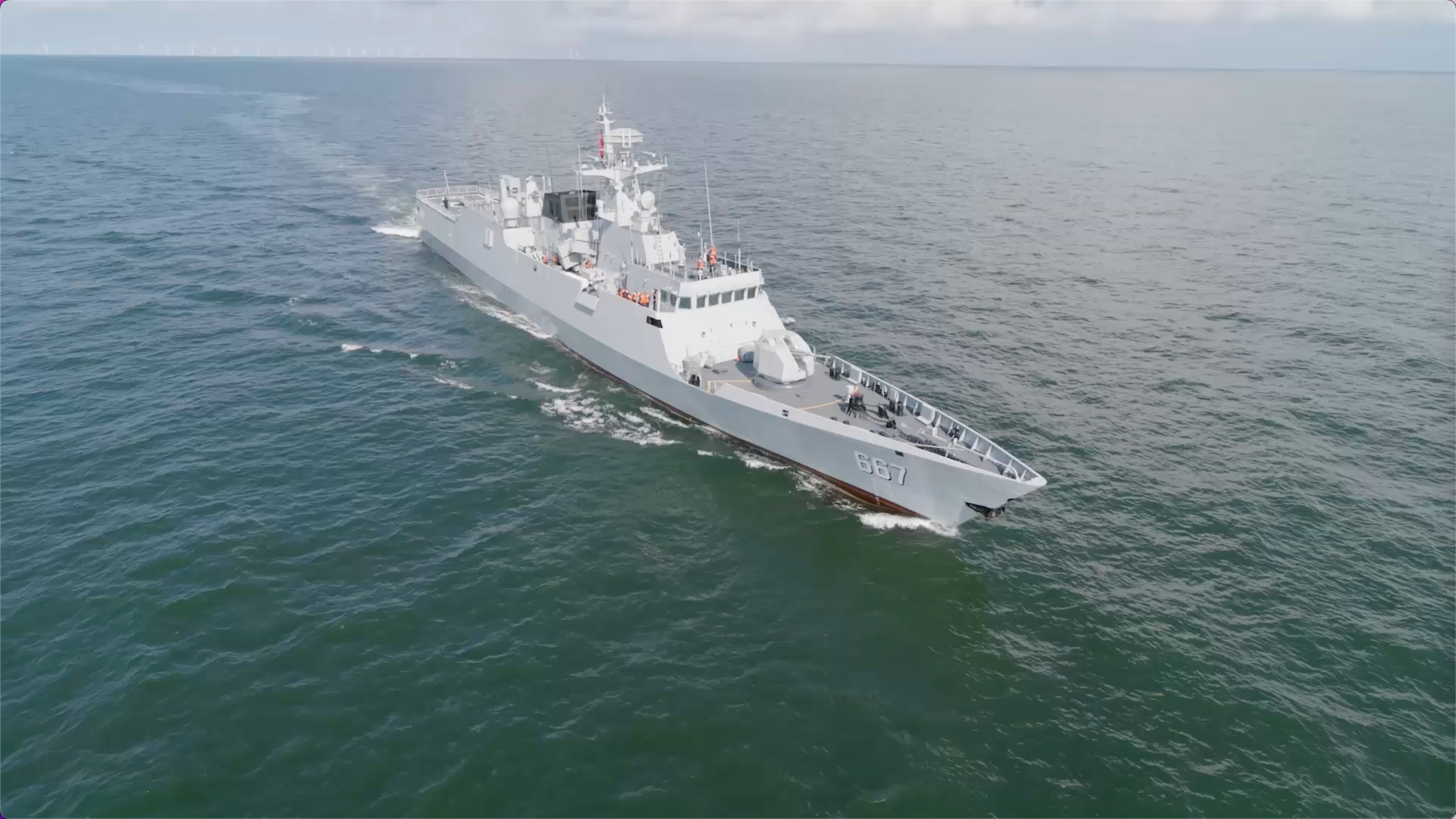 海军荆门舰,舷号667,是056A型护卫舰。该舰于2016年1月入列服役,总长90米,宽12米,排水量1400余吨。