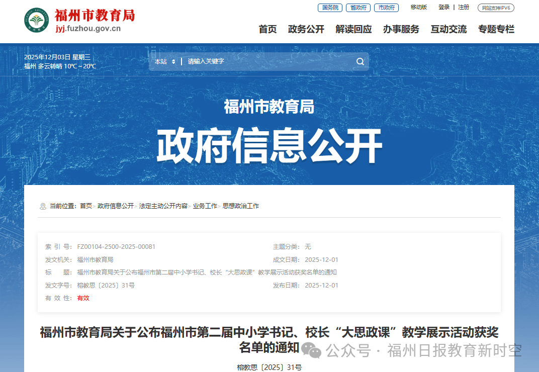 根据《福州市教育局关于举办福州市第二届中小学书记、校长“大思政课”教学展示活动的通知》(榕教思〔2025〕7号),经组织申报、专家评审、集体研磨、现场展示等程序,活动共评选出一等奖5名,二等奖9名,三等奖15名。现将获奖名单予以公布(见附件)。