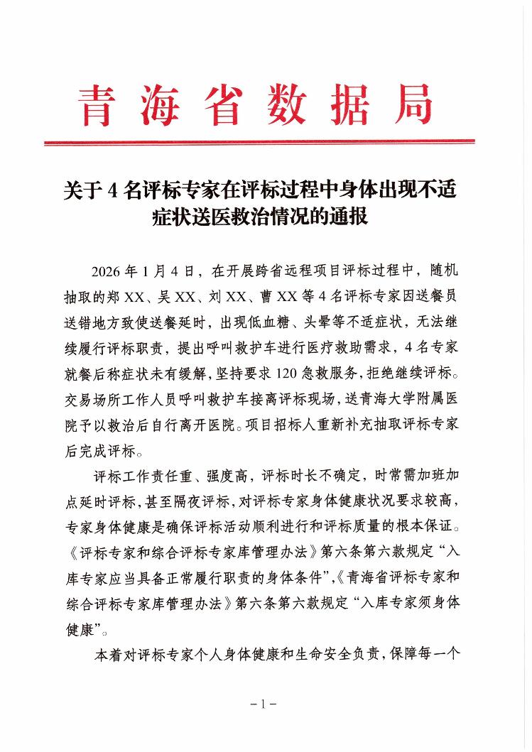 近日,青海省数据局发布情况通报称,1月4日,在开展跨省远程项目评标过程中,随机抽取的4名评标专家因送餐员送错地方致使送餐延时,出现低血糖、头晕等不适症状,无法继续履行评标职责,提出呼叫救护车进行医疗救助需求。4名专家就餐后称症状未有缓解,坚持要求120急救服务,拒绝继续评标,交易场所工作人员呼叫救护车将其接离评标现场,送青海大学附属医院予以救治后自行离开医院。项目招标人重新补充抽取评标专家后完成评标。