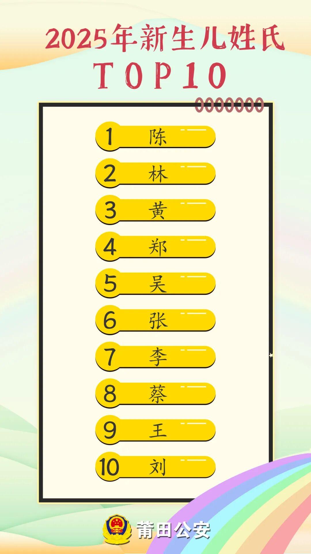在2025年莆田市出生登记的新生儿中,姓氏排行榜前十的分别依次是:“陈”“林”“黄”“郑”“吴”“张”“李”“蔡”“王”“刘”。
