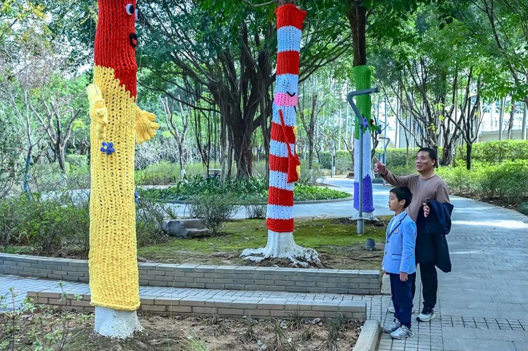 树衣配色呼应春节的喜庆氛围,织出的憨态笑脸仿佛正向路人拜年,将传统年味与可爱风格融为一体,让市民在逛公园时感受到浓浓的年味与城市的温度。