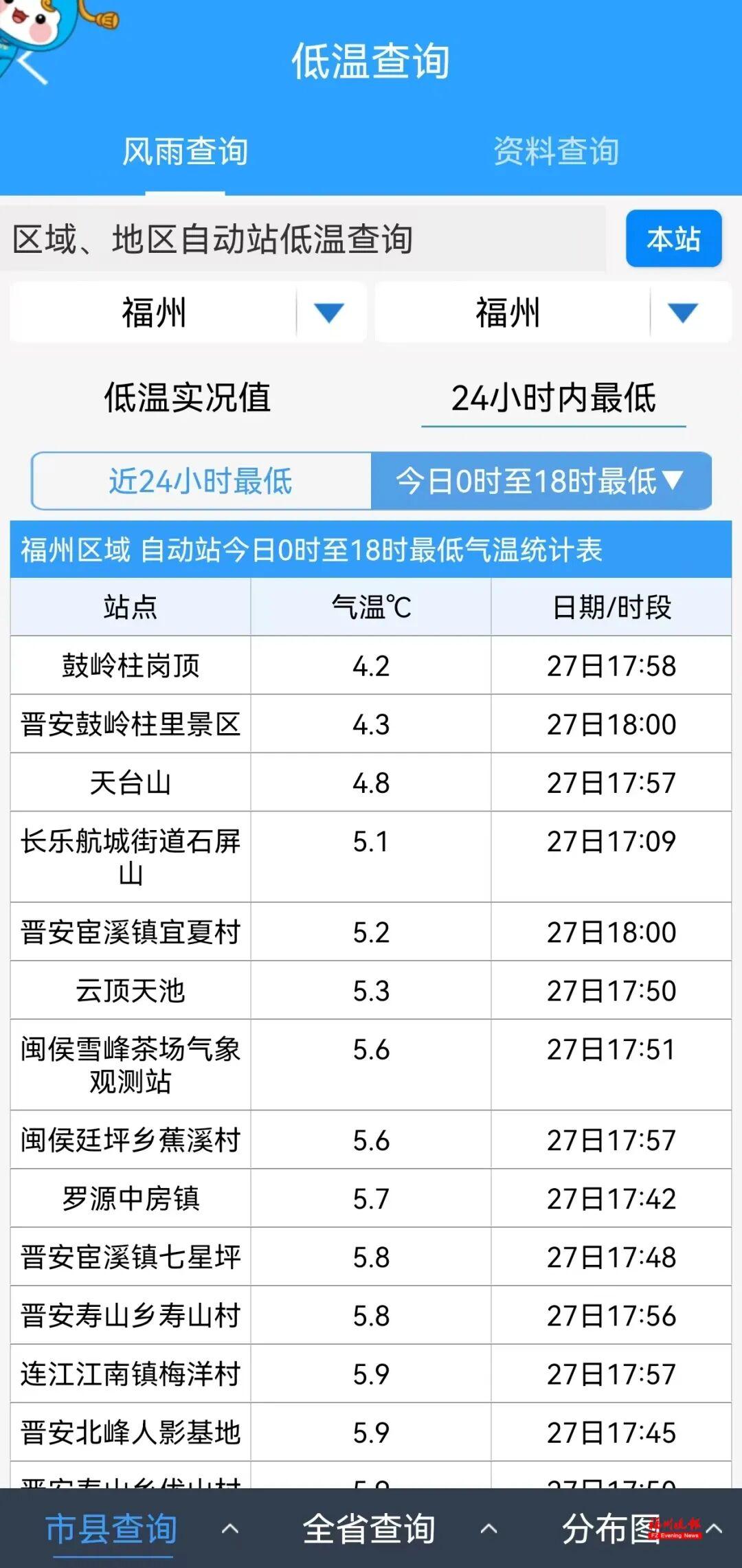 记者查询知天气App发现,27日0时至18时,鼓岭柱岗顶站点测得最低温仅4.2℃。