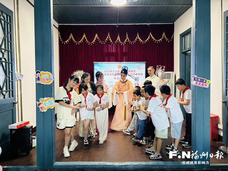 在福州职工子女暑托班上,孩子们学习闽剧表演。
