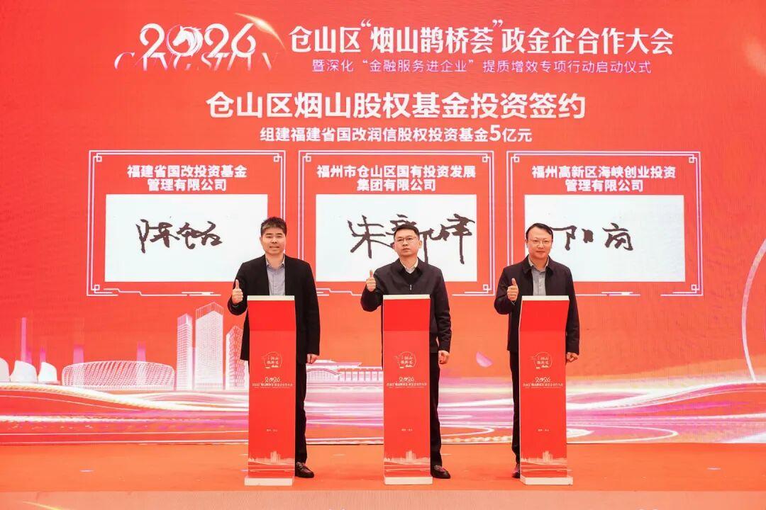 在基金投资签约环节,福建省国改投资基金管理有限公司、福州市仓山区国有投资发展集团有限公司、福州高新区海峡创业投资管理有限公司三方签约设立规模5亿元的福建国改润信股权基金。
