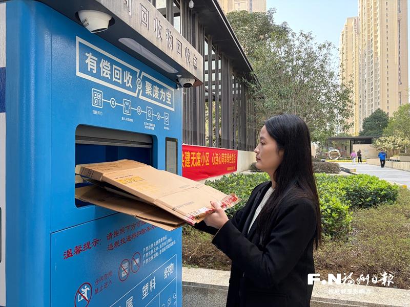 28日上午,市民林妹妹提着整理好的纸箱,走向小区入口处的可回收物回收点,手机扫码后仓门应声而开。这是福清市璀璨滨江小区常见的景象。