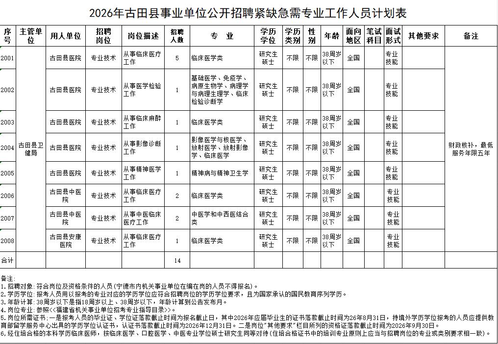 古田县卫生健康局关于2026年公开招聘紧缺急需人才的公告