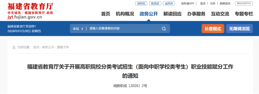 最新消息!福建省教育厅发布通知对高职分类招考中面向中职类考生的职业技能赋分标准进行详细规定。