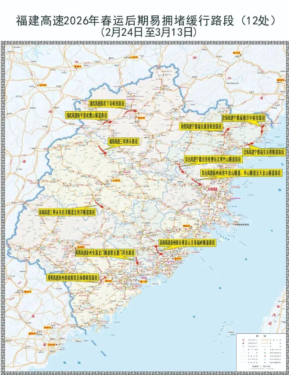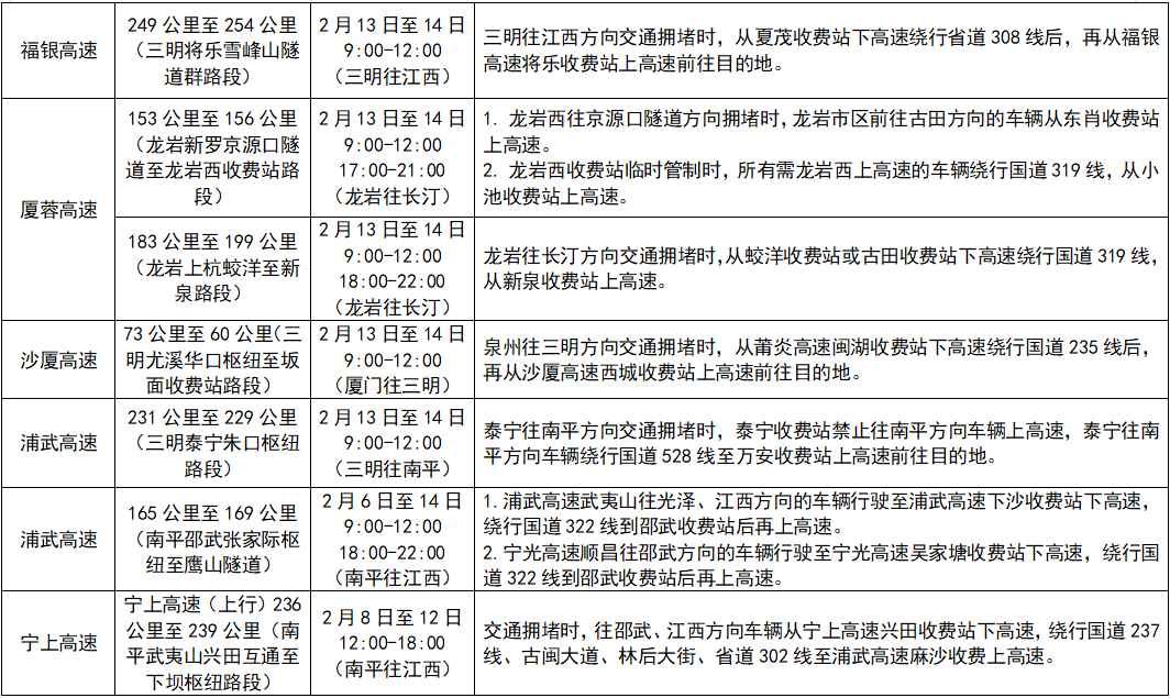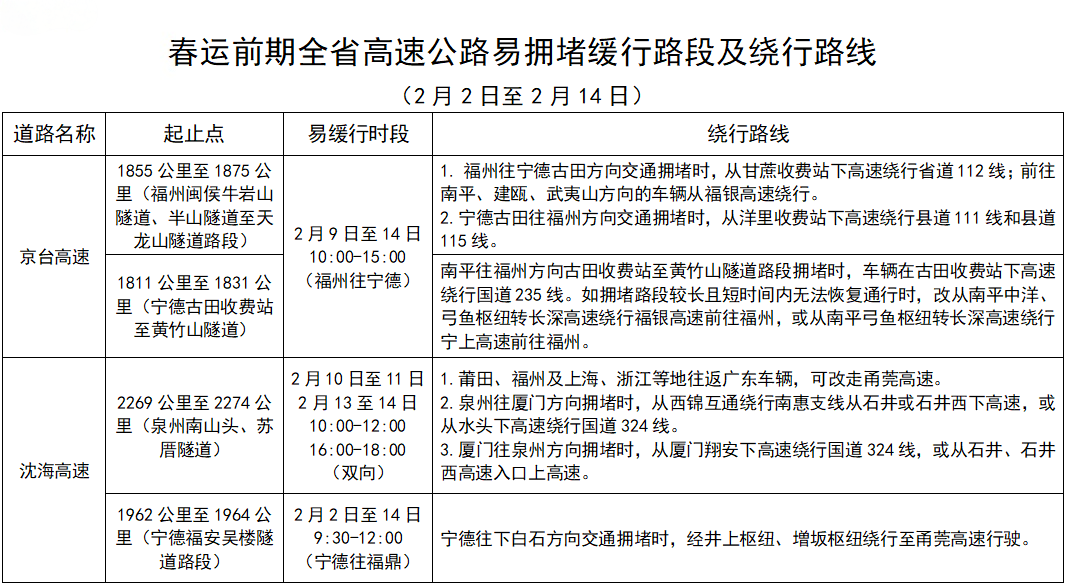 2.高速通行状况。拥堵缓行预计集中在7条高速公路12处路段,分别为:沈海高速宁德福安段(宁德往浙江)、福鼎段(宁德往浙江),浦武高速南平邵武段(下坝枢纽、鹰山隧道段,南平往浙江),福银高速三明将乐段(三明往福州),泉南高速泉州南安段(三明往泉州)、三明永安段(三明往泉州),京台高速福州闽侯段(宁德往福州)、宁德古田段(宁德往福州),甬莞高速泉州安溪至厦门同安段(泉州往厦门)、漳州南靖段(漳州往厦门),宁上高速宁德福安段(宁德往浙江)。