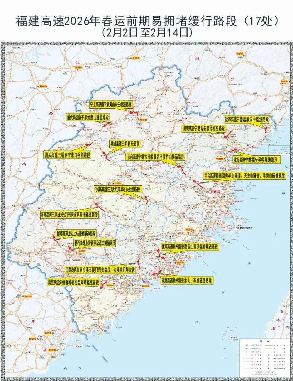 2.高速通行状况。拥堵缓行预计集中在11条高速公路26处路段,分别为:甬莞高速福州永泰路段(福州往莆田)、漳州南靖段(双向)、泉州安溪段(双向),厦门同安段(双向),沈海高速福州福清段(福州往莆田)、泉州南安段(双向)、泉港段(莆田往泉州)、宁德福安段(宁德往福鼎)、福鼎段(双向)、霞浦段(双向)、漳州漳浦段(双向),京台高速福州闽侯段(双向)、宁德古田段(双向),泉南高速泉州南安段(双向)、三明永安段(双向),厦蓉高速漳州长泰段(双向)、龙岩上杭段(双向)、新罗段(新罗往上杭),浦武高速南平邵武段(下坝枢纽、鹰山隧道,南平往浙江),福银高速福州闽清段(三明往福州)、三明将乐段(三明往福州),沙厦高速三明尤溪段(三明往泉州),政永高速龙岩永定段(龙岩往永定),宁上高速南平武夷山段(南平往宁德),长深高速南平延平段(双向)。